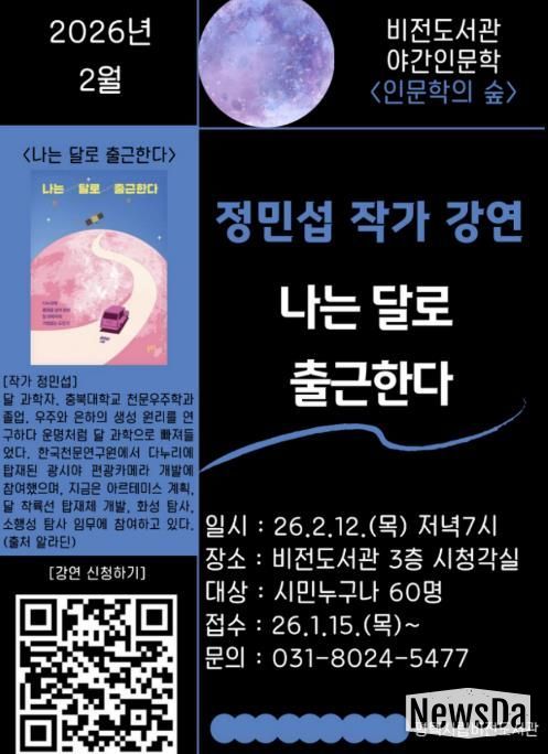 뉴스다 최광묵 기자 | 평택시 비전도서관은 오는 2월 12일 저녁 7시 달 과학자 정민섭 작가를 초청하여 ‘나는 달로 출근한다’를 주제로 야간 인문학 강연을 진행한다.
