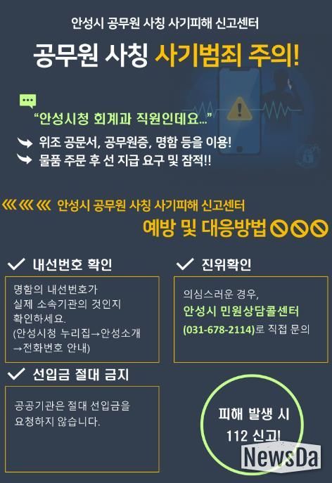 안성시 관계자는 “안성시 공무원은 어떠한 경우에도 선입금을 요구하지 않는다”며 “수상하거나 의심스러운 연락을 받았을 경우, 즉시 신고센터로 문의해 달라”고 당부했다.