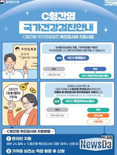 뉴스다 최광묵 기자 | 고양특례시 일산서구보건소는 질병관리청의 C형간염 관리 강화 방침에 따라, 2026년부터 국가건강검진 C형간염 항체 양성자에 대한 ‘확진검사비 지원 사업’이 종합병원 및 상급종합병원까지 확대 시행된다고 밝혔다.