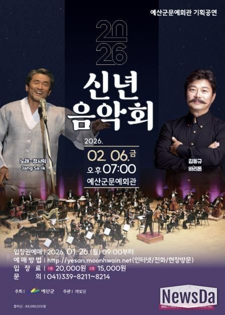 뉴스다 최광묵 기자 | 예산군은 군민과 함께 희망찬 2026년 새해를 여는 ‘2026년 신년 음악회’를 오는 2월 6일 오후 7시 예산군문예회관 공연장에서 개최한다고 밝혔다.