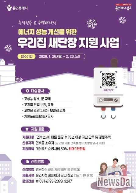 뉴스다 최광묵 기자 | 용인특례시가 오는 26일부터 2월 20일까지 노후주택 에너지 효율 개선 지원 사업인 ‘우리집 새단장 지원사업’ 신청을 받는다고 16일 밝혔다.