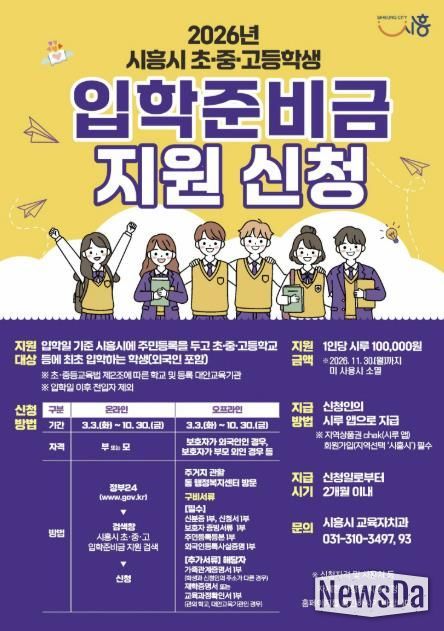 뉴스다 최광묵 기자 | 시흥시는 올해부터 관내 초중고 입학 자녀 가정에 입학준비금을 10만 원씩 지원한다. 이번 지원은 도서나 문구류 등을 새로 마련해야 하는 신입생 가정의 경제적 부담을 줄여주고, 교육 기본권을 강화하고자 추진됐다.