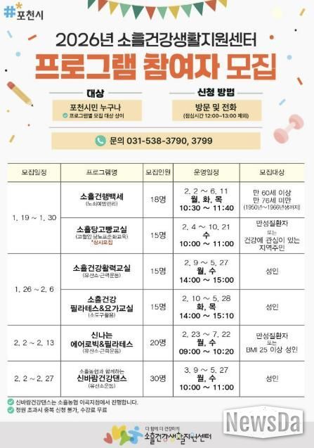 뉴스다 최광묵 기자 | 포천시 소흘건강생활지원센터는 시민들의 건강 증진과 활기찬 일상 지원을 위해 오는 19일부터 ‘2026년 상반기 건강증진 프로그램’ 참여자를 모집한다.