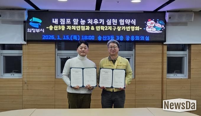 뉴스다 최광묵 기자 | 의정부시 송산3동행정복지센터는 1월 15일 청사 3층 공용회의실에서 민락2지구상가번영회와 ‘내 점포 앞 눈 치우기 협약’을 맺었다.