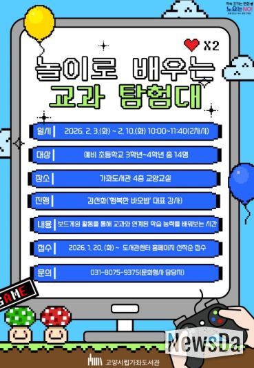 뉴스다 최광묵 기자 | 고양특례시 가좌도서관은 2월 3일부터 방학특강 프로그램 ‘놀이로 배우는 교과 탐험대’을 운영한다.