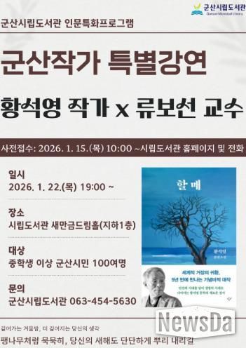 뉴스다 최광묵 기자 | 군산시립도서관에서 22일 저녁 7시 한국 문학의 거목 황석영 작가를 초청하여 ‘군산작가 특별강연’이 열린다.