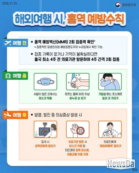 홍역 예방을 위한 수칙으로는 ▲해외여행 전 홍역 예방백신(MMR) 2회 접종력 확인하기 ▲해외여행 중 ① 사람이 많은 곳에서는 마스크 착용, ② 흐르는 물에 30초 이상 비누로 손 씻기, ③기침할 때는 옷소매로 입과 코 가리기 ▲해외여행 후(의심 증상 발생 시) ① 입국 시 검역관에게 알리기, ② 의료기관 방문 시 마스크 착용, ③ 대중교통 이용 자제 등이 있다.