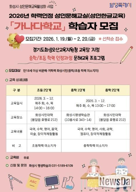 뉴스다 최광묵 기자 | 화성특례시는 19일부터 2월 20일까지 2026년 성인을 위한 한글교실 ‘가나다학교’ 및 ‘늘배움학교’ 수강생을 선착순 모집한다고 19일 밝혔다.