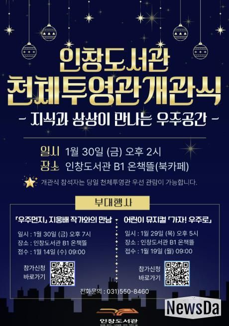 또한 1월 29일 오후 5시에는 우주인이 되기 위한 훈련 과정을 그린 우주과학 뮤지컬 ‘가자! 우주로’가 운영돼, 어린이들에게 우주에 대한 호기심과 상상력을 키워줄 것으로 기대된다. 행사와 관련한 자세한 사항은 인창도서관 홈페이지를 참고하거나 도서관정책팀으로 문의하면 된다.