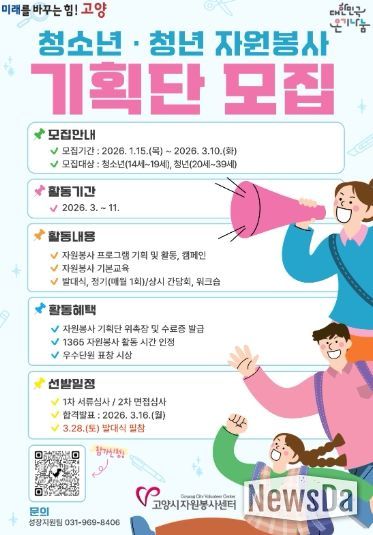 뉴스다 최광묵 기자 | 고양시자원봉사센터는 청소년과 청년이 직접 자원봉사 활동을 기획하고 실행하는‘2026년 청소년·청년 자원봉사 기획단’ 단원을 모집한다고 밝혔다.