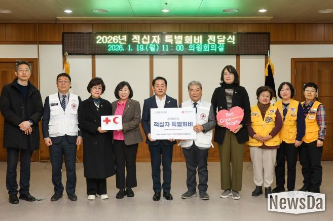 뉴스다 최광묵 기자 | 의정부시의회는 19일 의원회의실에서 대한적십자사 경기도지사(회장 이재정)에 ‘2026년도 적십자 특별회비’를 전달했다.