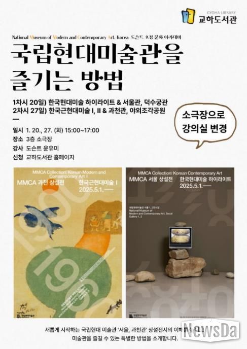 뉴스다 최광묵 기자 | 파주시 교하도서관은 오는 20일과 27일, 15시부터 17시까지 교하도서관 3층 소극장에서 전문 안내원(도슨트) 초청 강연 프로그램 ‘국립현대미술관을 즐기는 방법’을 운영한다.