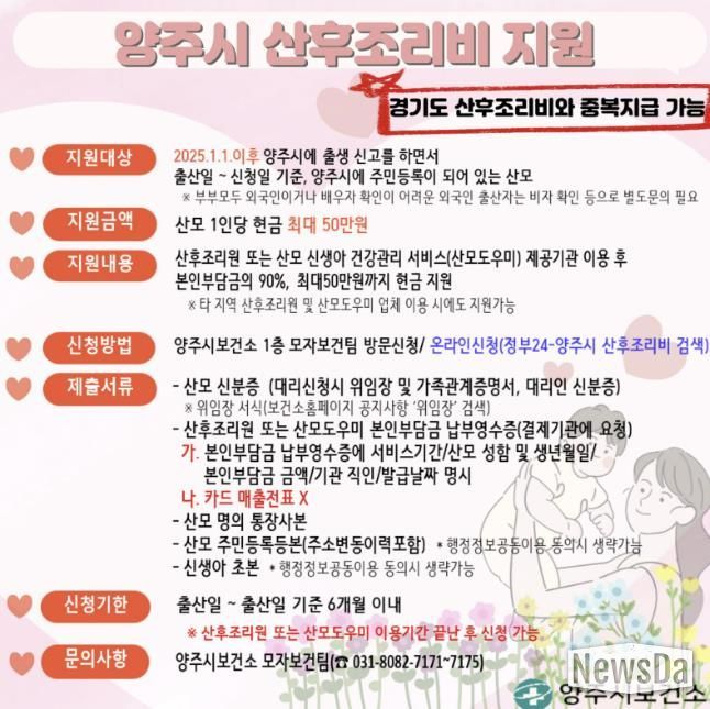 뉴스다 최광묵 기자 | 양주시보건소가 2025년 1월 1일 출생아부터 관내 출산가정을 대상으로 ‘양주시 산후조리비 지원사업’을 시행하고 있다.
