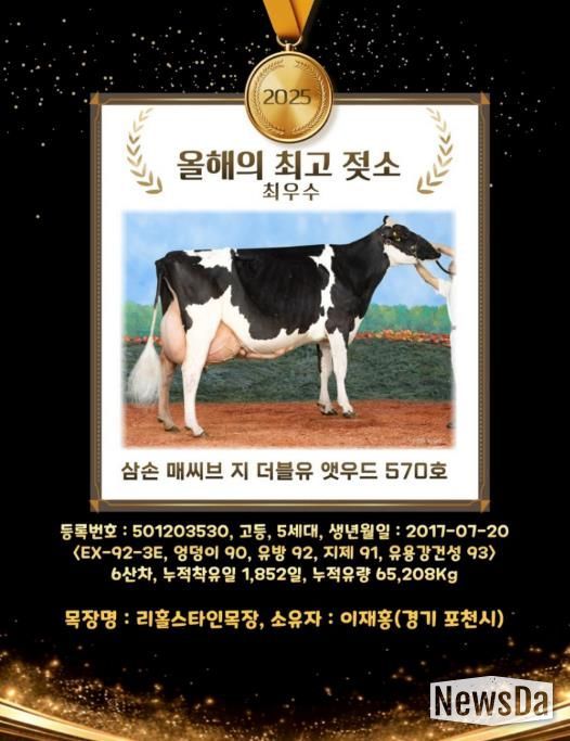 뉴스다 최광묵 기자 | 포천시는 관내 낙농농가인 리홀스타인목장(대표 이재홍)이 2025년 ‘올해의 최고 젖소’를 배출했다고 밝혔다.