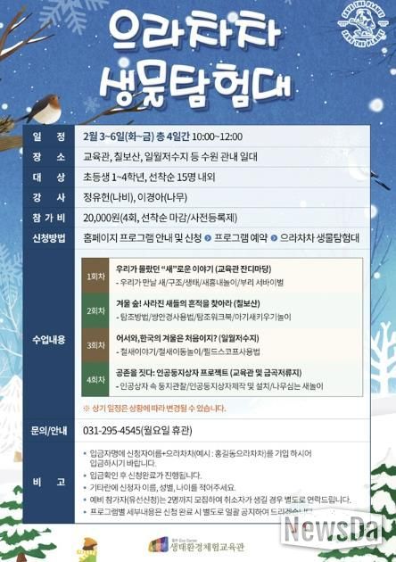 뉴스다 최광묵 기자 | 칠보생태환경체험교육관이 겨울방학 프로그램 ‘으라차차 생물탐험대(겨울 탐조프로젝트)’에 참여할 초등학교 1~4학년 어린이 15명을 선착순으로 모집한다.