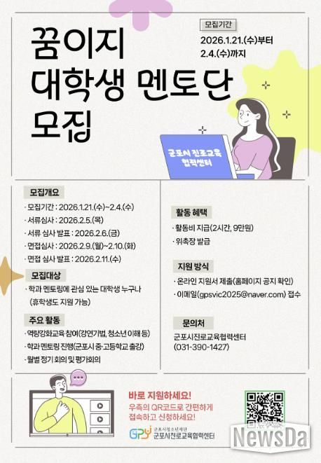뉴스다 최광묵 기자 | (재)군포시청소년재단 군포시진로교육협력센터는 관내 청소년의 진로 탐색과 진로 역량 강화를 위해 '2026년 군포시진로교육협력센터 교육기부자'를 모집한다고 밝혔다.