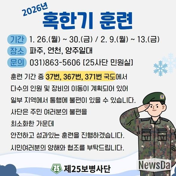 뉴스다 최광묵 기자 | 육군 제25보병사단이 2026년 1월 26일부터 30일까지 파주시ㆍ양주시 일대에서, 2026년 2월 9일부터 13일까지 파주시ㆍ양주시ㆍ연천군 일대에서 각 1주간 혹한기 훈련을 실시한다.