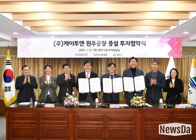 뉴스다 최광묵 기자 | 원주시와 강원특별자치도는 22일 오후 3시 30분, 원주시청 7층 투자상담실에서 ㈜케이투앤과 공장 증설을 위한 투자협약을 체결했다.