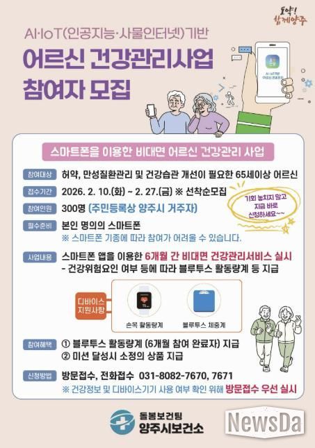 뉴스다 최광묵 기자 | 양주시 보건소가 관내 65세 이상 어르신을 대상으로 스마트폰을 활용한 비대면 건강관리 프로그램인 ‘인공지능(AI)·사물인터넷(IoT) 기반 어르신 건강관리사업’을 추진한다.