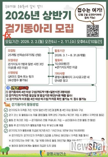 뉴스다 최광묵 기자 | 광명시가 시민의 건강 증진과 일상 속 걷기 문화 확산을 위해 오는 2월 2일부터 11일까지 ‘2026년 상반기 걷기동아리’ 참가팀을 모집한다.