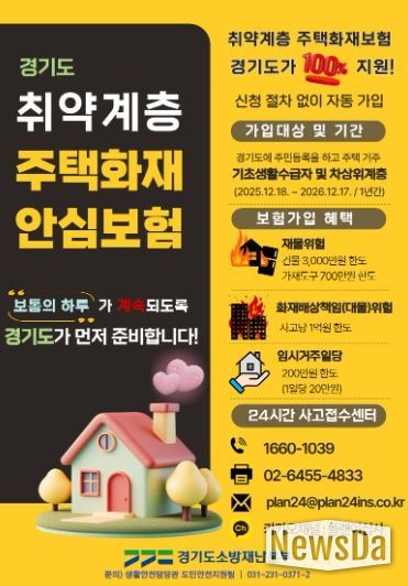 해당 보험은 경기도에 주민등록을 두고 주택(단독‧공동주택)에 거주 중인 기초생활수급자와 차상위계층 37만 9천여 가구를 대상으로 하며, 별도 신청 없이 자동 가입된다.