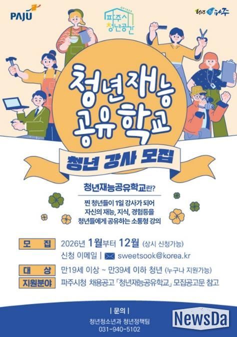 뉴스다 최광묵 기자 | 파주시는 2026년 1월부터 12월까지 청년을 대상으로 '청년재능공유학교' 청년강사를 연중 상시 모집한다.