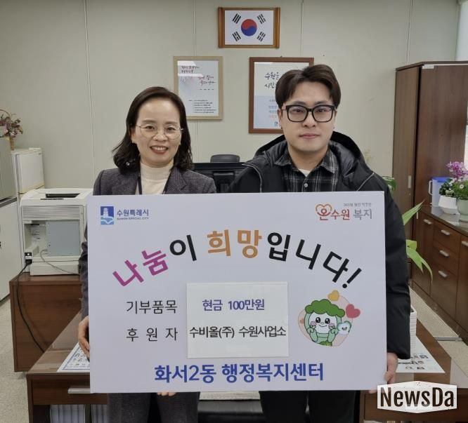 뉴스다 최광묵 기자 | 수원시 팔달구 화서2동에 위치한 수비올㈜ 수원사업소는 설 명절을 앞두고 지난 26일 화서2동 행정복지센터를 방문해 지역 내 어려운 이웃을 돕기 위한 이웃돕기 성금 100만 원을 기탁했다.