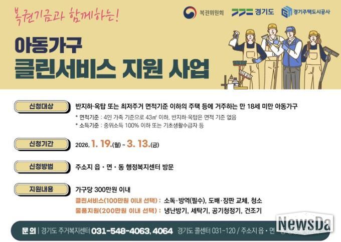 뉴스다 최광묵 기자 | 부천시는 주거취약 아동의 건강한 성장과 주거권 보호를 위해 ‘2026년 아동가구 클린서비스 지원사업’을 복권기금과 함께 추진한다고 27일 밝혔다.