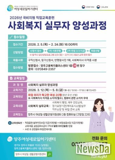 뉴스다 최광묵 기자 | 양주여성새로일하기센터가 2월 5일부터 24일까지 여성 구직자를 대상으로 직업교육훈련 과정인 ‘사회복지 실무자 양성과정’ 교육생 20명을 모집한다.