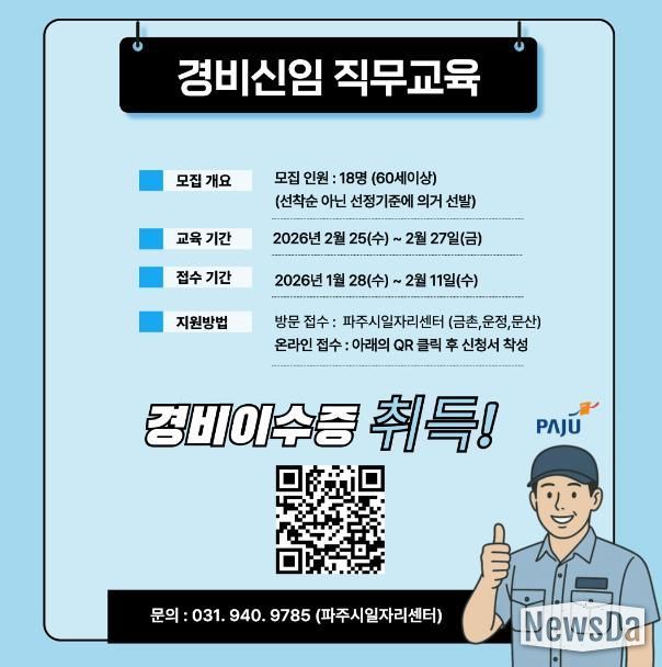 뉴스다 최광묵 기자 | 파주시는 경비 분야 취업을 희망하는 시민을 대상으로 ‘경비 신임 직무교육’참여자 18명을 모집한다.