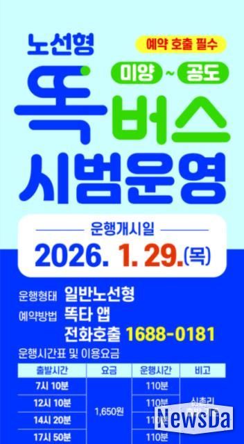 뉴스다 최광묵 기자 | 안성시는 1월 29일부터 미양면과 공도읍을 직접 연결하는 노선형 똑버스를 운행한다.