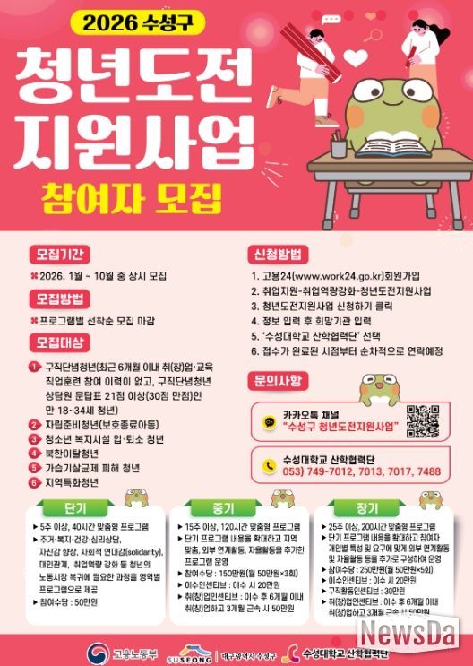 뉴스다 최광묵 기자 | 대구 수성구는 구직에 어려움을 겪는 청년을 대상으로 2026년도 ‘청년도전 지원사업’ 참여자 130명을 모집한다고 밝혔다.