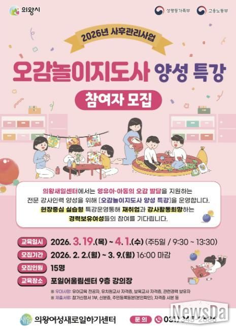 뉴스다 최광묵 기자 | 의왕시 여성새로일하기센터가 '오감놀이지도사 양성 특강'의 교육생을 모집한다.