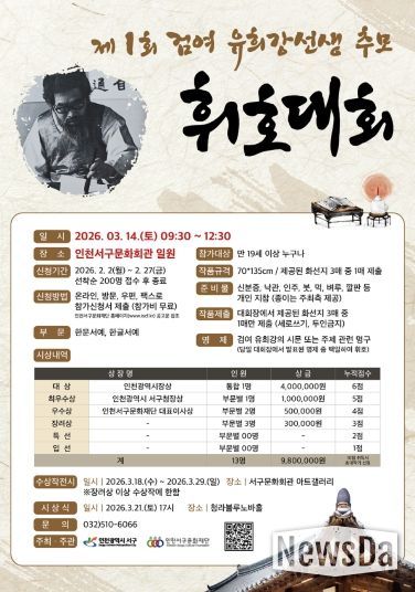 뉴스다 최광묵 기자 | 인천서구문화재단은 오는 2월 2일부터 2월 27일까지 ‘제1회 검여 유희강 선생 추모 휘호대회’ 참가자를 모집한다.