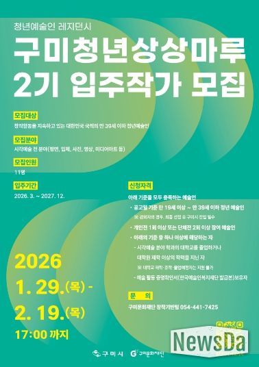 뉴스다 최광묵 기자 | (재)구미문화재단(대표이사 이한석)은 청년 예술인의 창작 역량 강화와 지역 문화예술 활성화를 위해 청년예술인 레지던시 공간인 구미청년상상마루 2기 입주작가를 모집한다.
