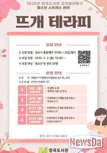 뉴스다 최광묵 기자 | 김포시 양곡도서관은 2026년 교육발전특구 사업의 일환으로 청소년 및 성인을 대상으로 한 스트레스 관리 프로그램 '뜨개 테라피'를 운영한다.