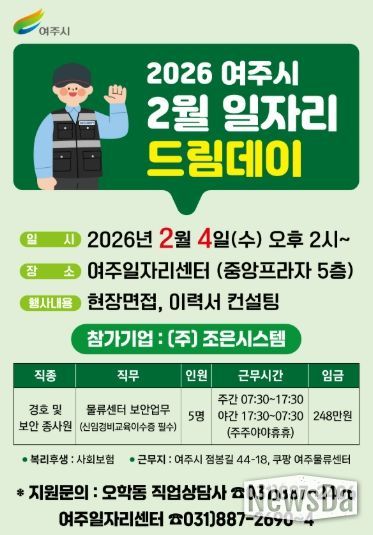 뉴스다 최광묵 기자 | 여주시는 오는 2월 4일 오후 2시 여주일자리센터(세종로 14번길 18, 중앙프라자 5층)에서 ‘2026년 2월 여주시 일자리드림데이’를 연다.
