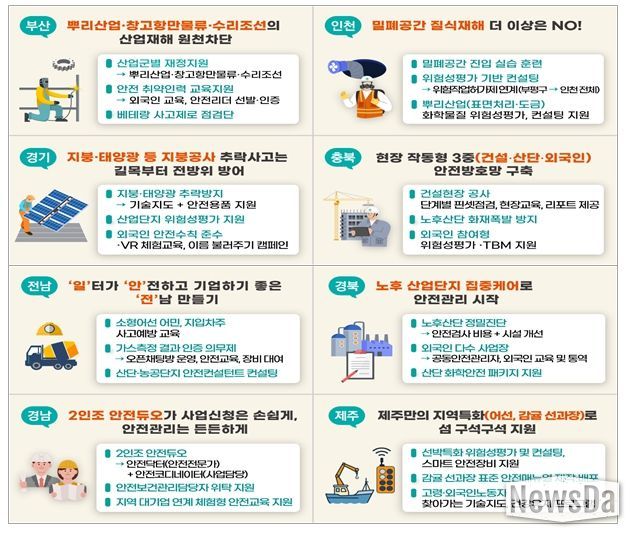 이번 사업은 중앙정부와 지방정부가 힘을 합쳐 촘촘한 중대재해 예방 시스템을 구축하기 위해 올해 신설됐다. 지난 12월 공모를 통해 지역별 산업 현황과 재해 유형 등에 맞는 특화사업을 기획한 8개 지방정부가 선정됐으며, 예방사업에 약 143억원이 투입될 예정이다.