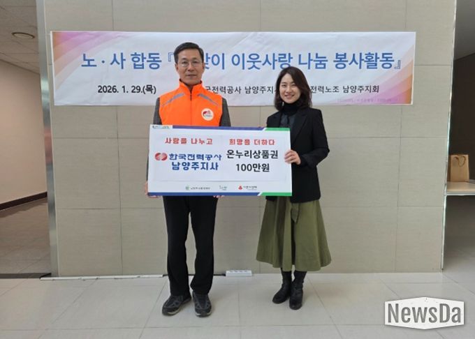 뉴스다 최광묵 기자 | 남양주시는 지난 29일 한국전력공사 남양주지사가 설 명절을 맞아 취약계층 지원과 전통시장 활성화를 위해 온누리상품권 100만 원을 동부희망케어센터에 전달했다고 30일 밝혔다.