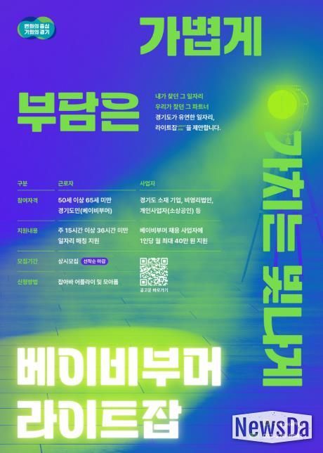 뉴스다 최광묵 기자 | 경기도가 베이비부머 세대의 안정적인 일자리 재진입을 지원하는 ‘라이트잡(Light Job)’ 사업을 올해도 추진하기로 하고, 2일부터 참여기업을 상시 모집한다.