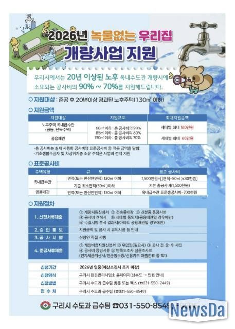 뉴스다 최광묵 기자 | 구리시는 2026년 수도관 개량 공사비 지원 사업의 신청을 오는 2월 2일부터 접수한다고 밝혔다.