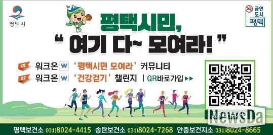 뉴스다 최광묵 기자 | 평택시는 시민들의 건강증진을 위해 스마트폰 하나로 누구나 쉽게 참여할 수 있는 모바일 건강 커뮤니티 ‘평택시민 모여라(워크온)’을 활발히 운영 중이라고 밝혔다.