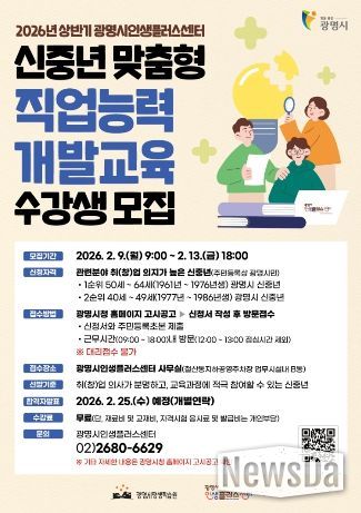 뉴스다 최광묵 기자 | 광명시 인생플러스센터는 신중년의 취업 경쟁력을 높이고 성공적인 인생 재도약을 지원하기 위해 오는 13일까지 ‘2026년 상반기 신중년 맞춤형 직업능력개발교육과정’ 수강생을 모집한다.