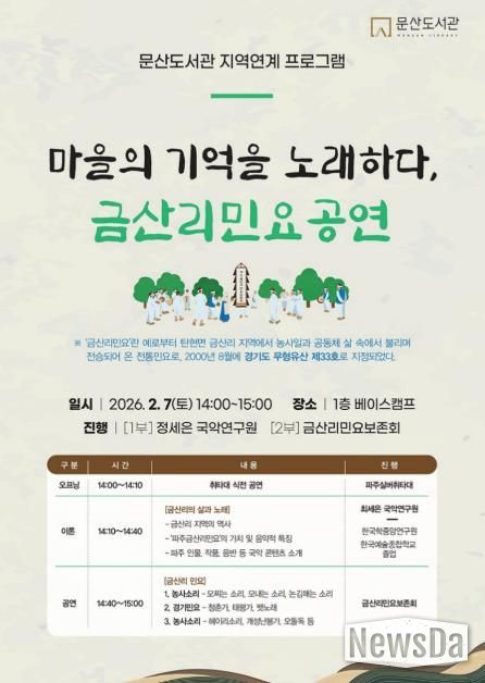 뉴스다 최광묵 기자 | 파주시 문산도서관은 오는 7일 경기도 무형유산 제33호 ‘파주금산리민요’를 주제로 강연과 공연이 함께하는 ‘렉처 콘서트’를 개최한다.