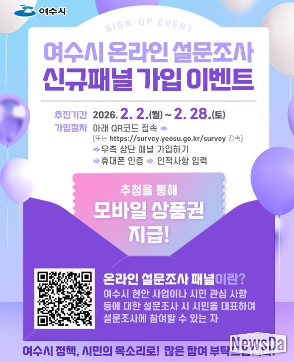뉴스다 최광묵 기자 | 여수시가 2월 한 달간 ‘온라인 설문조사 신규 패널 가입 이벤트’를 실시한다.