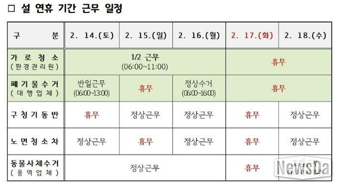 이와 함께 연휴 기간 중 생활폐기물 수거 일정을 공동주택 게시판, 안내방송, 홈페이지 등을 통해 알리고, 음식물 쓰레기 감량과 올바른 분리배출방법도 적극 홍보 예정이다.