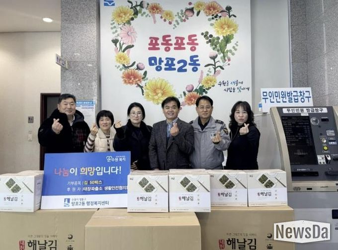 뉴스다 최광묵 기자 | 영통구 망포2동 행정복지센터는 지난 2일, 태장파출소 생활안전협의회가 설 명절을 맞아 저소득 가정을 지원하기 위해 김 50박스를 망포2동 행정복지센터(동장 이용태)에 기탁했다고 밝혔다.