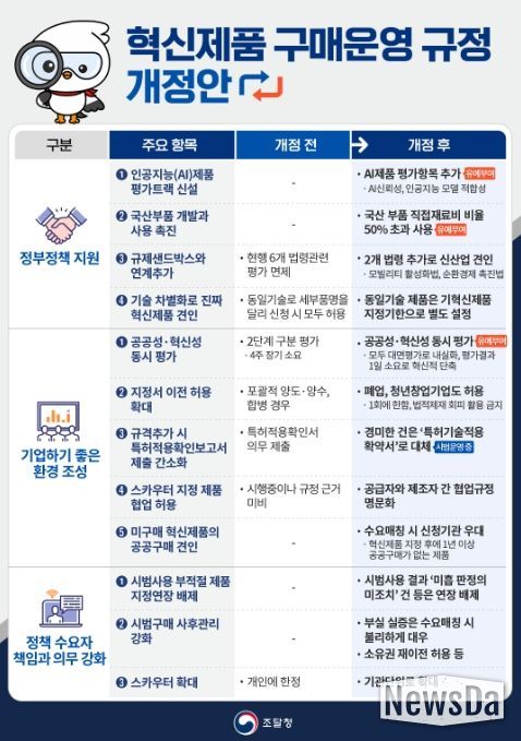 뉴스다 최광묵 기자 | 조달청은 공공분야 혁신조달을 확대하여 우리 경제의 혁신 성장을 견인하기 위해 '혁신제품 구매 운영 규정'을 개정하여 2월 3일부터 시행한다.