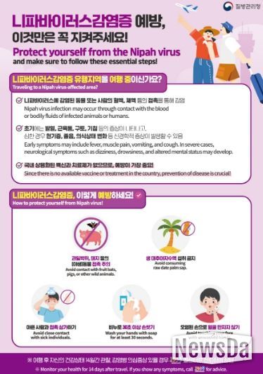 감염 예방을 위해서는 △비누로 30초 이상 손 씻기 △과일박쥐, 돼지 등 야생동물과의 접촉 피하기 △생 대추야자수액 등의 음료, 바닥에 떨어진 과일 섭취 자제 △환자와의 직접 접촉 피하기 등의 수칙을 지켜야 한다.