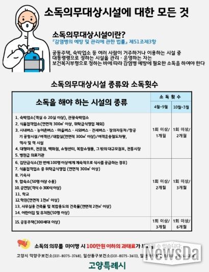 이에 고양시 3개 보건소는 소독의무대상시설에 소독기준과 횟수를 안내하고 소독실시 여부를 정기적으로 점검할 계획이다.